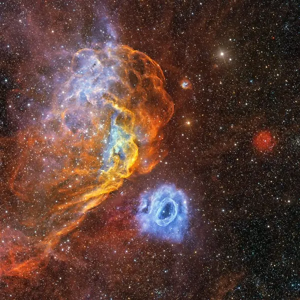 Located in the Large Magellanic Cloud, NGC 2014 is the large red nebula in this frame with NGC 2020 shining blue shaped by a huge Wolf Rayet star that has ejected its outer layers. The Wolf Rayet star that lights NGC 2020 shines 200,000 times brighter than our sun. NGC 2014 contains a group of large bright stars which are 10 to 20 times larger than our sun.