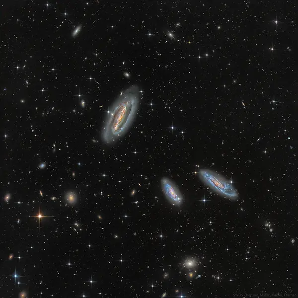 Along with NGC 5560 and 5569, NGC 5566 forms a trio of interacting galaxies almost 90 million light-years away, toward the constellation Virgo. On the left, two, spiky, foreground Milky Way stars echo the trio of galaxy's hues, a reminder that stars in our own galaxy are like those in these distant island universes.